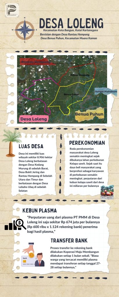 Kepala Desa Loleng, Kecamatan Kota Bangun Rafi’i mengungkapkan, hampir 40 persen wilayah Desa Loleng di atas perkebunan besar swasta PT Prima Mitrajaya Mandiri (PMM). “Hak Guna Usaha (HGU) PT PMM di Desa Loleng ini hanya kebun tanaman sawitnya. Sementara pabrik CPO ada Desa Benua Puhun dan Rantau Hempang Kecamatan Muara Kaman,” ucapnya.