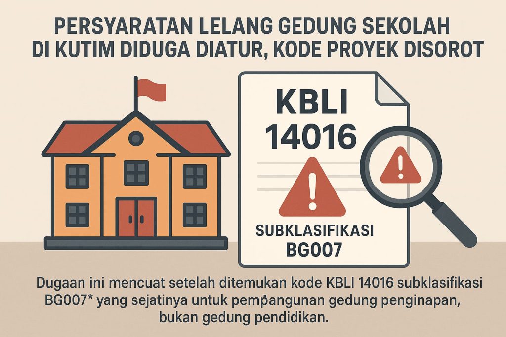 Lelang tersebut berada di bawah bidang Pendidikan Menengah (Dikmen) Dinas Pendidikan Kutai Timur, dengan sistem mini kompetisi yang berlangsung hanya tiga hari. Dalam berkas pengumuman, panitia mencantumkan kode KBLI 14016 Subklasifikasi BG007, yakni konstruksi gedung penginapan dan perhotelan. Padahal, untuk gedung sekolah, seharusnya digunakan kode BG006, sesuai klasifikasi konstruksi gedung pendidikan.